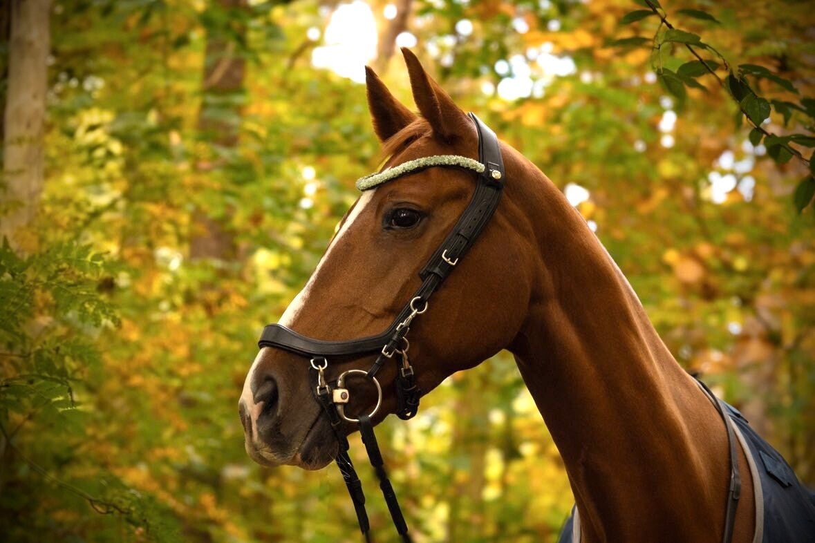 Laat jouw paard stralen met een prachtige unieke door Zen Steen ontworpen handgemaakte frontriem van leer met prehniet steentjes.